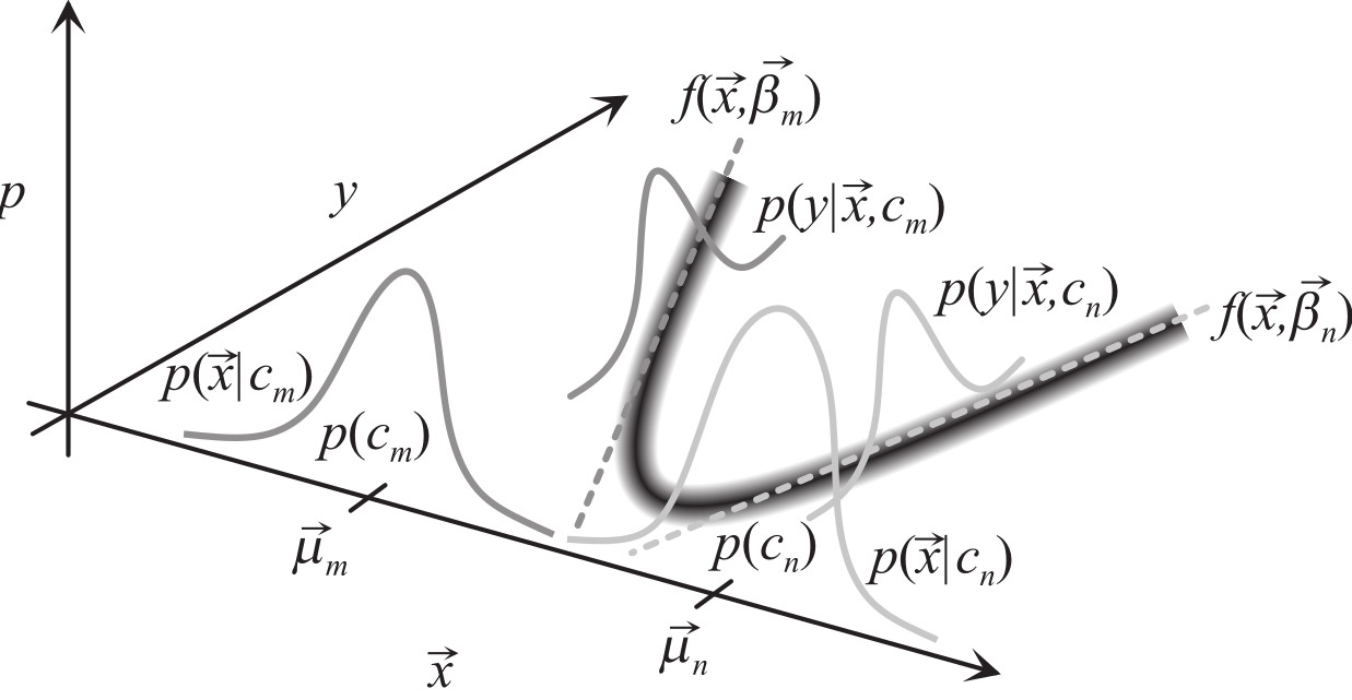 In $D$ dimensions a mixture model can be written by factoring the density over multivariate Gaussians, where $c_m$ refers to the $m$th Gaussian with mean $\vec{\mu}_m$ and variance $\vec{\sigma}_m$: