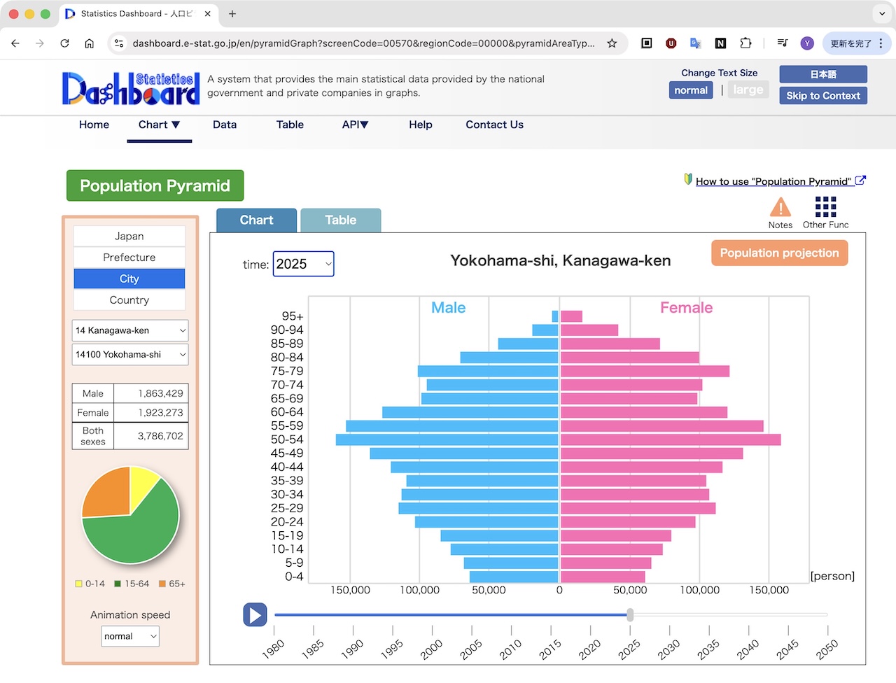 I want to load datasets/Population Pyramid_Kanagawa-ken Yokohama-shi_2050.csv as well and use a toggle switch to switch between the plots. I also want to clearly indicate the year being displayed (2025 or 2050).
