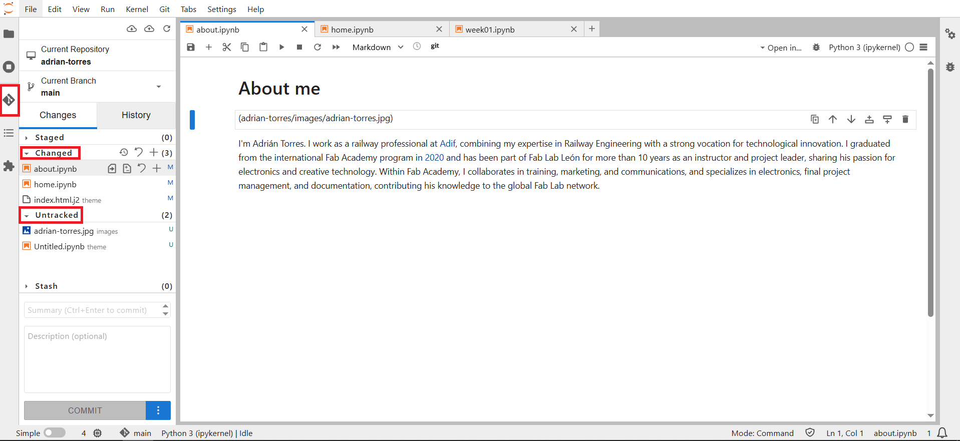 - Now, in the left-hand menu, we find the GIT logo. We click on it, and a drop-down menu appears. We see changes and untracked items such as uploaded images.