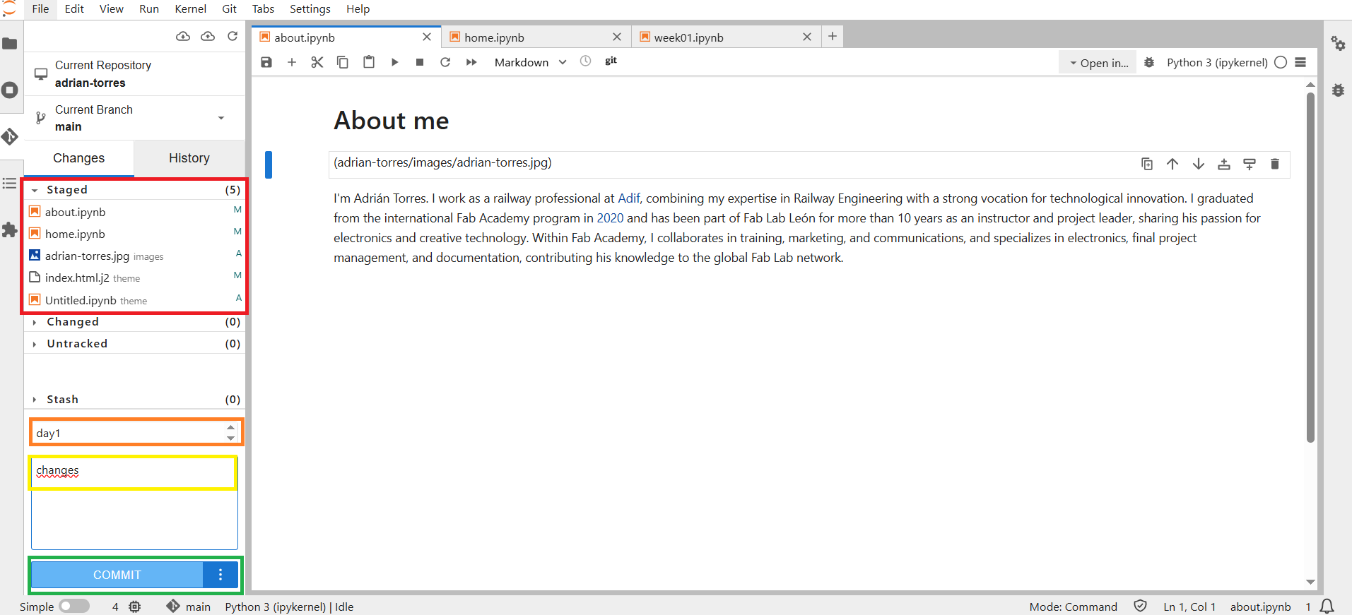 - This automatically moves all files to Staged. Now we need to name the commit and add a comment (optional), then click the Commit button.