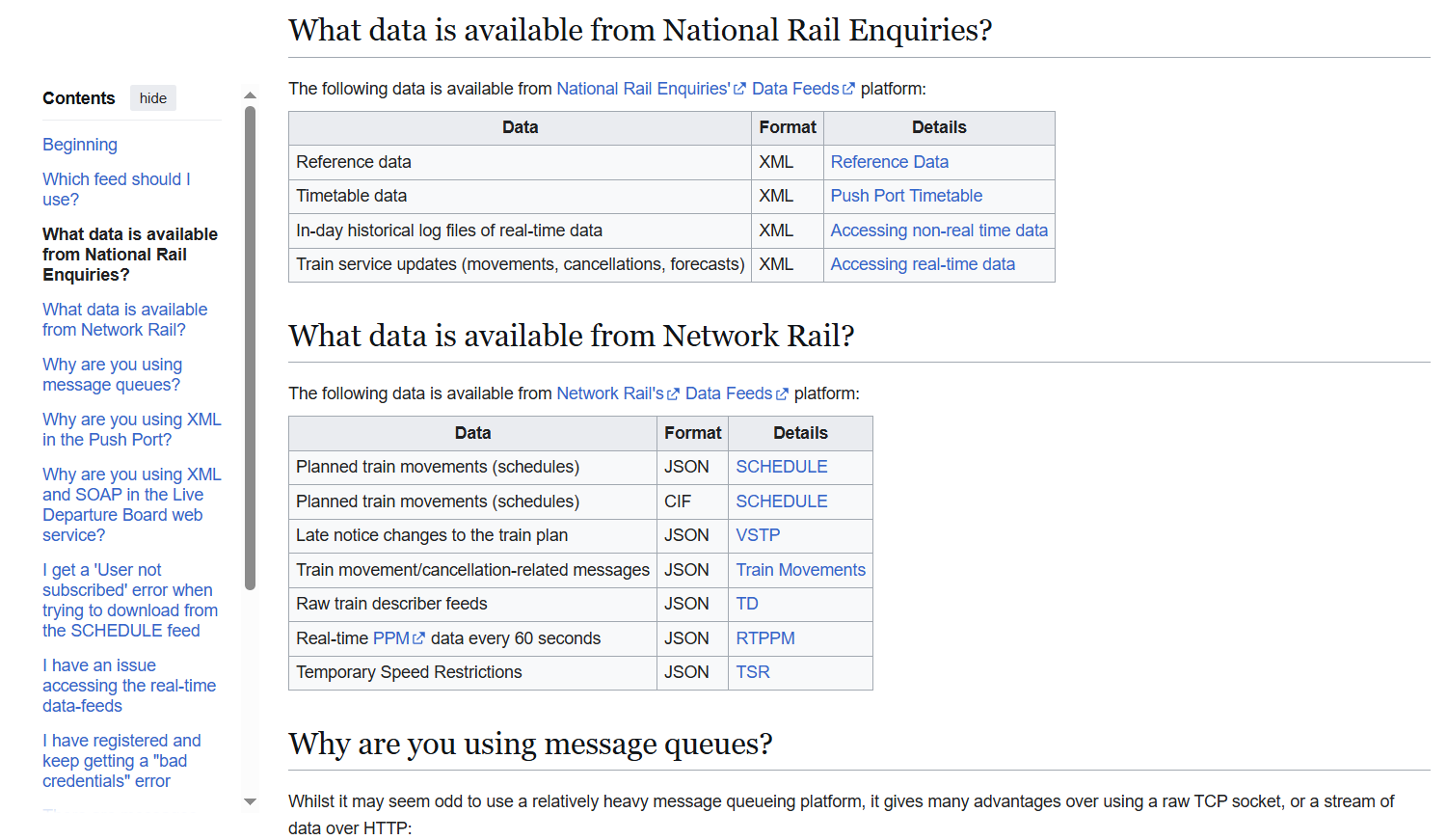Network Rail and National Rail (UK): Uses a Wiki page, where there are also links to JSON, XLS or CSV.