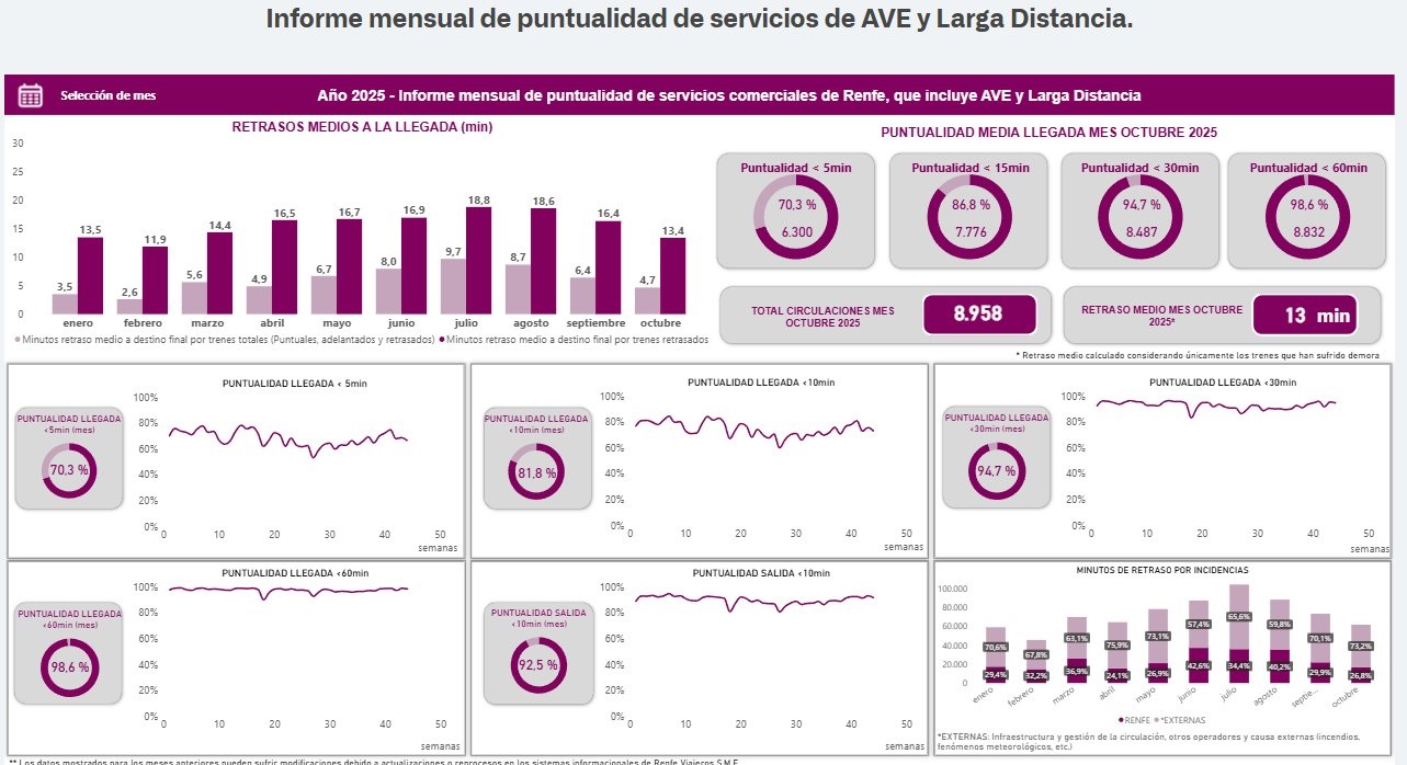 My goal is to process some of this data and display it in the tables or similar graphs that Renfe produces every month. (This one is in Spanish, but it shows, for example, the percentage of delays on high-speed trains).