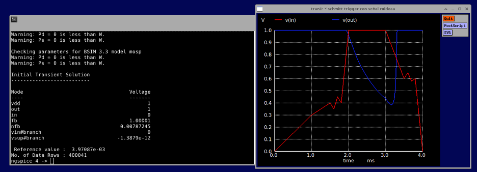 To better understand how the Schmitt trigger rejects noise, I created a second simulation with a noisy input signal: