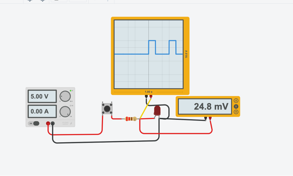 Falstad Circuit Simulator was also used to visualize circuit behavior in the browser. I tested a simple LED + resistor + button circuit and used the oscilloscope view to observe the signal waveforms.
