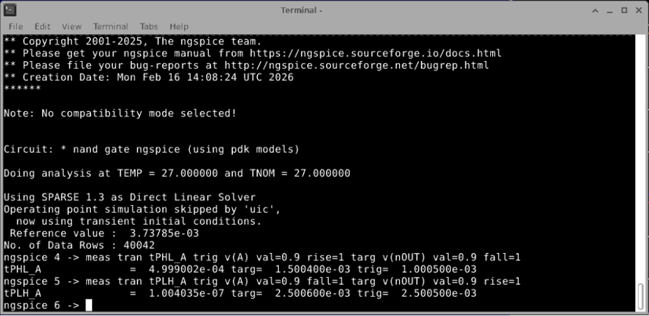 - Reuse and.sp netlist to make a 2-input NAND gate (remove the output inverter) and change the models to refer to the PDK models