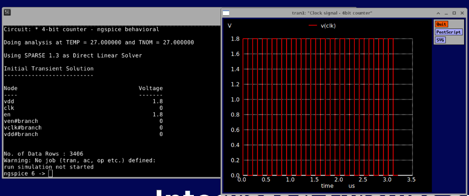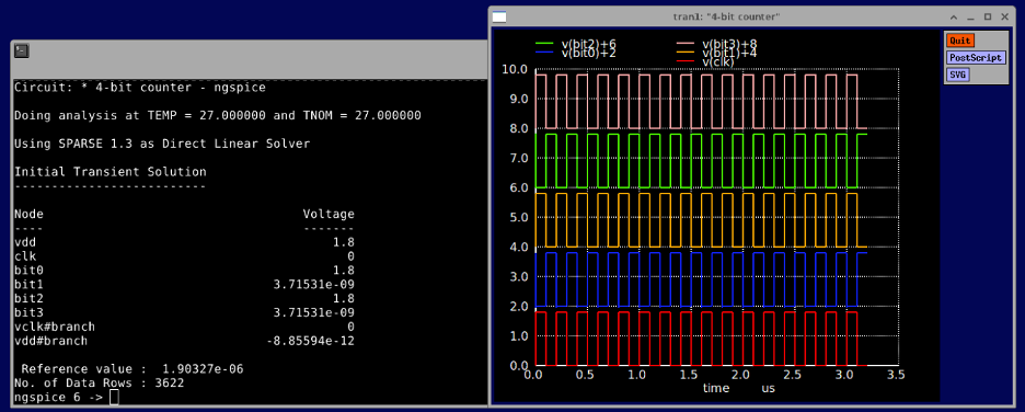 For this assignment I designed a 4-bit counter behavioral simulation in ngspice. This counter is the starting point for the APOLLO-4G chip project.