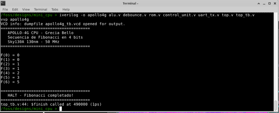 The APOLLO-4G is a complete 4-bit stored-program CPU designed from scratch using the Sky130A open-source 130nm CMOS technology and the full open-source ASIC toolchain. It computes the Fibonacci sequence using a program stored in an internal ROM and transmits each result serially via UART at 115200 baud.