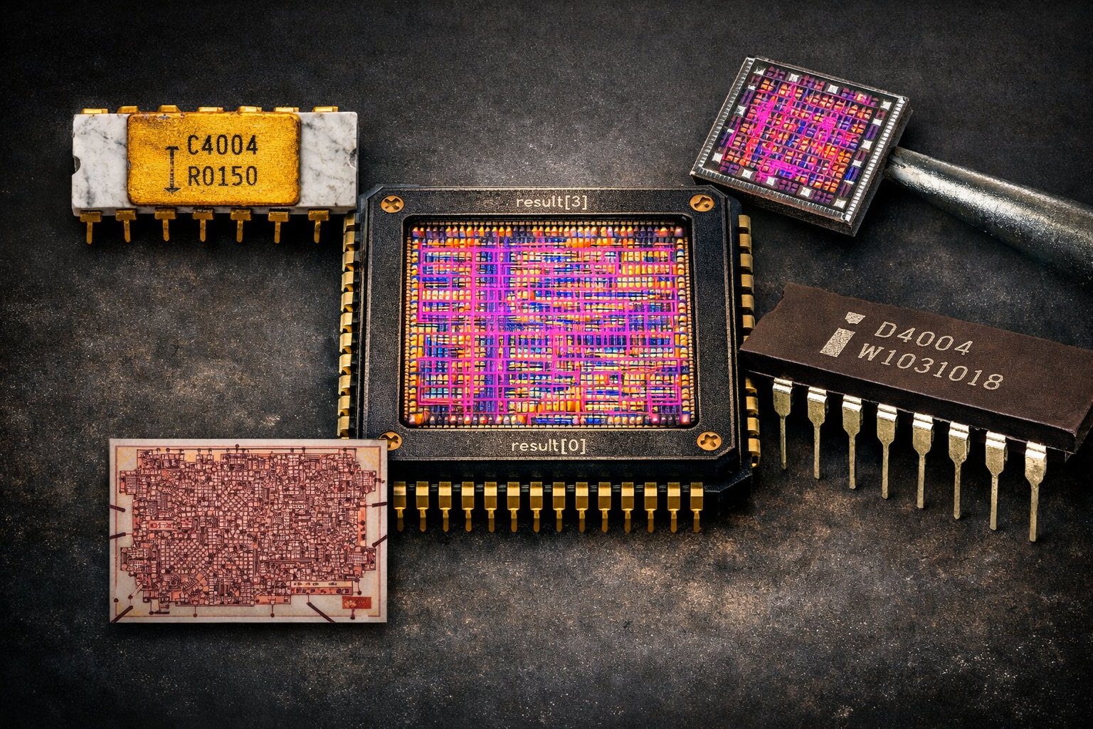 The Intel 4004 was fabricated in a 10µm process with 2,300 transistors and ran at 740 kHz. The APOLLO-4G is fabricated in a 130nm process, runs at 50 MHz, and uses approximately 1,300 transistors fewer because the design is simpler, but vastly faster. The connection between these two chips, separated by 55 years of semiconductor history, became the conceptual foundation of the entire project.