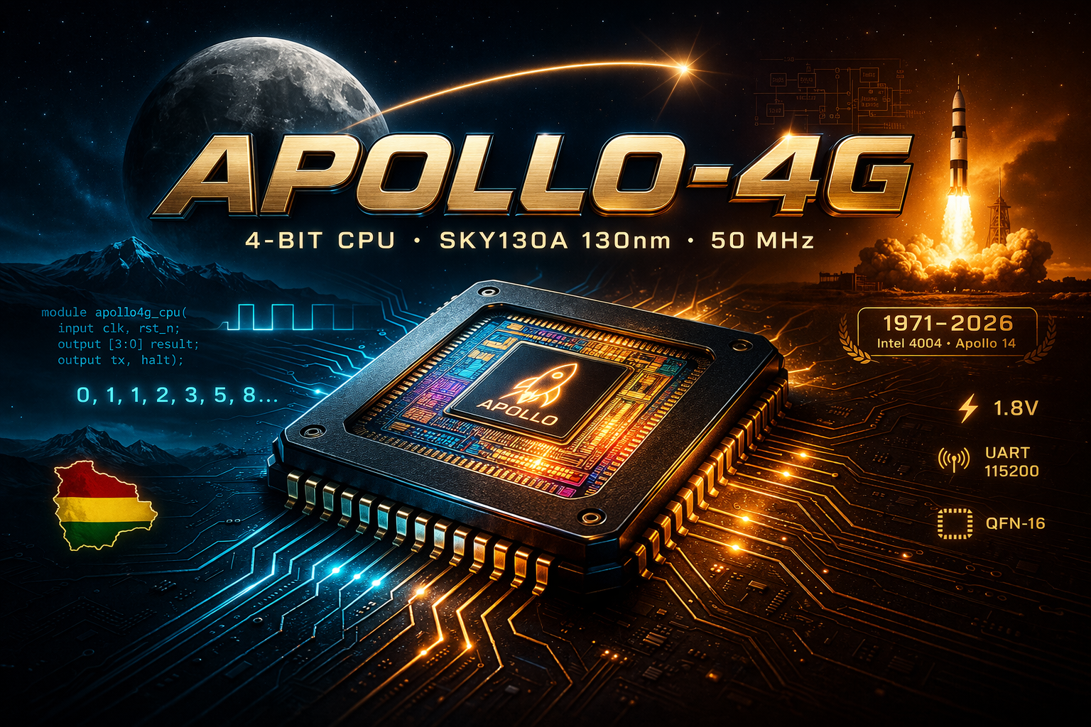 The name pays tribute to two milestones of 1971: the Intel 4004 the world’s first commercial microprocessor, which was also a 4-bit CPU and the Apollo 14 mission, which landed on the Moon that same year. Like the 4004, the APOLLO-4G fetches instructions from a ROM and processes 4-bit data. Unlike the 4004, it was designed using only free, open-source tools.
