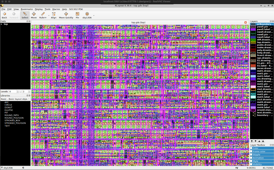 The final GDS was opened in KLayout with the Sky130A technology loaded: