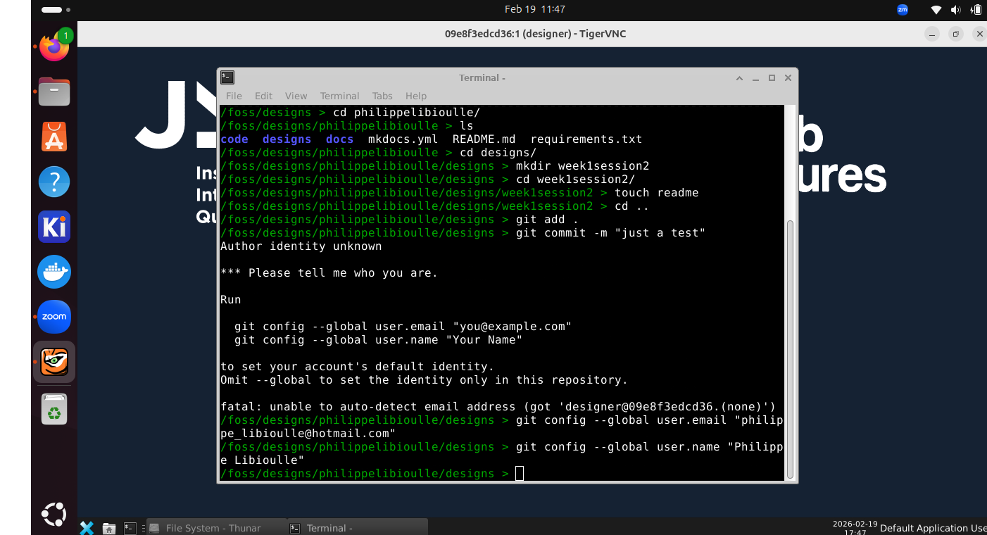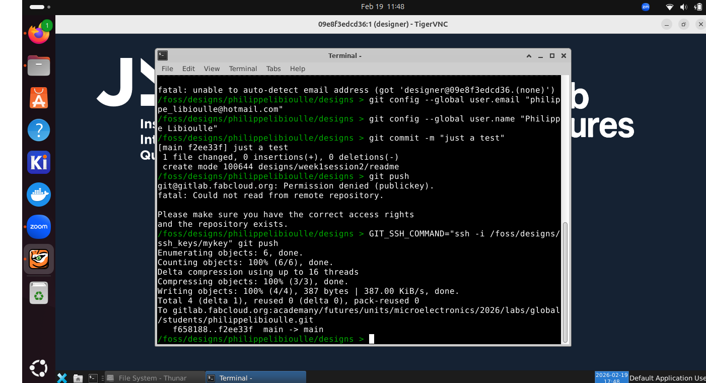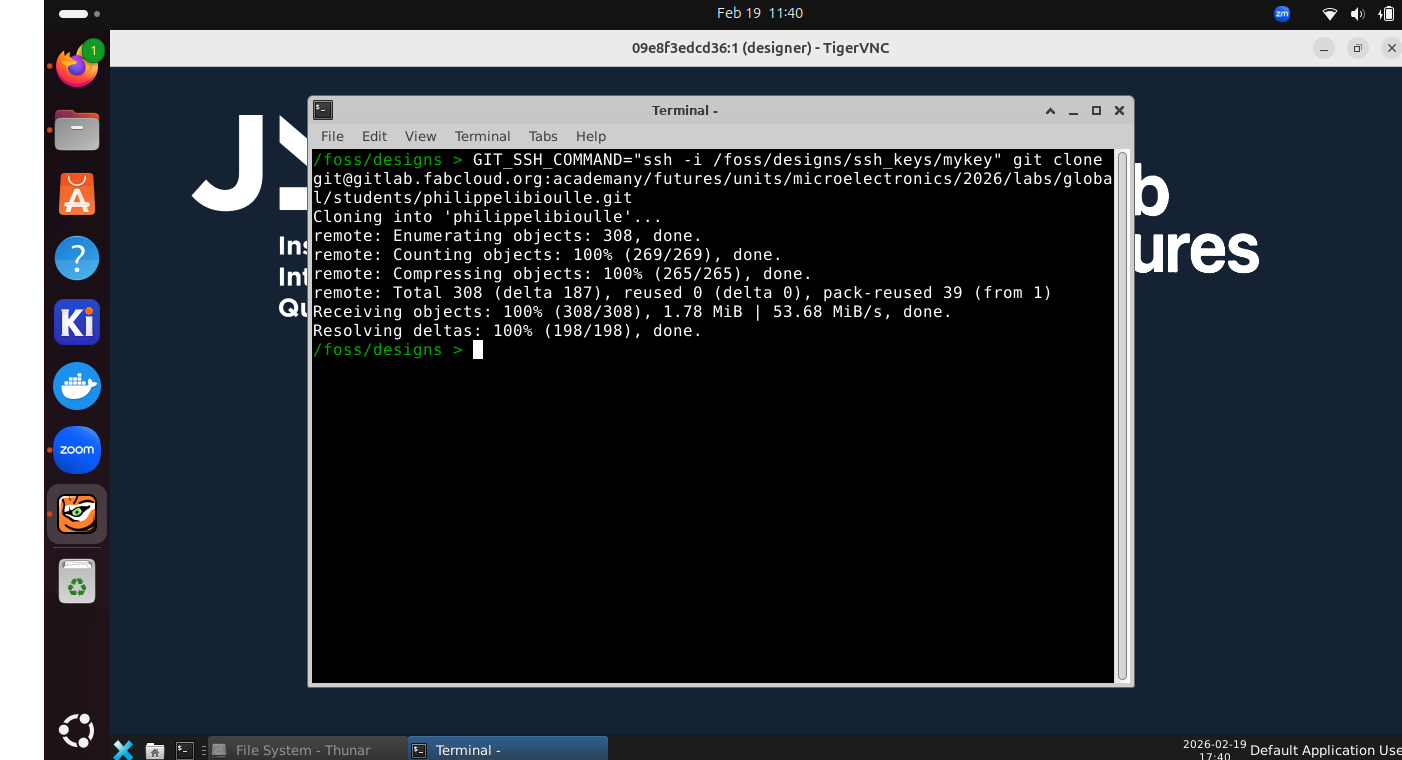 IMPORTANT: by default, an instance of a Docker image does not keep any information permanently. We have been told to store our designs in the /foss/designs folder.