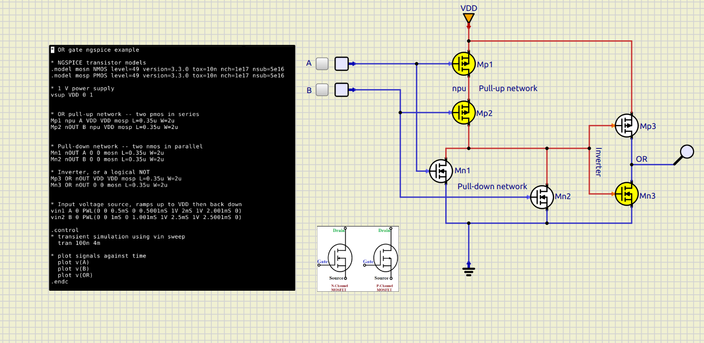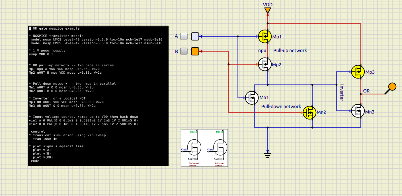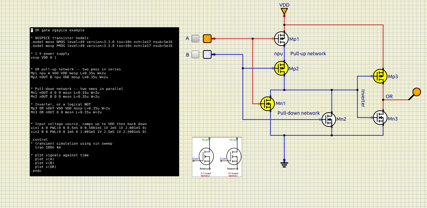 Here is the OR gate for this assignment, with A and B low. This was mainly a question ou rearraging the pull-down and pull-up networks.