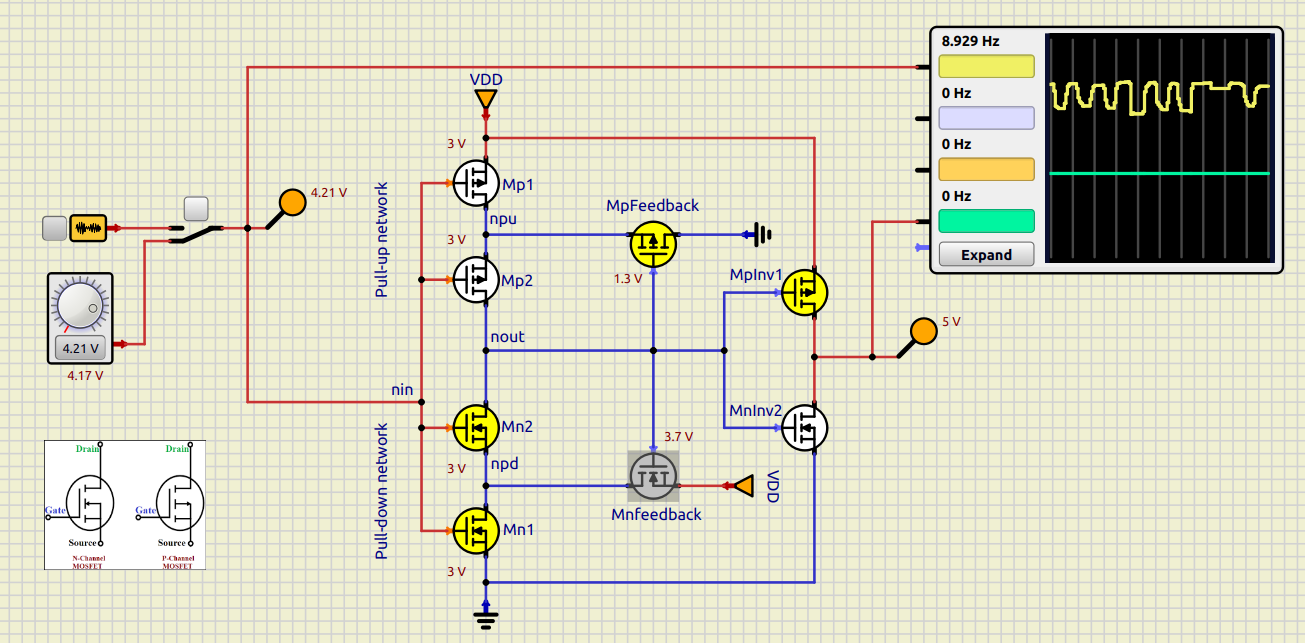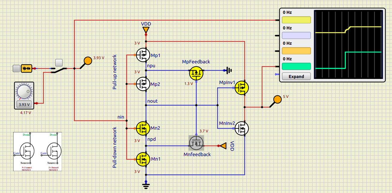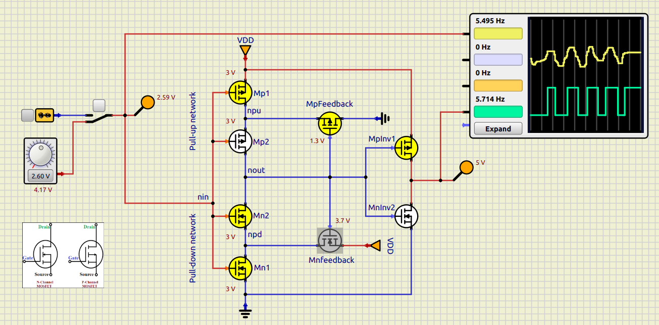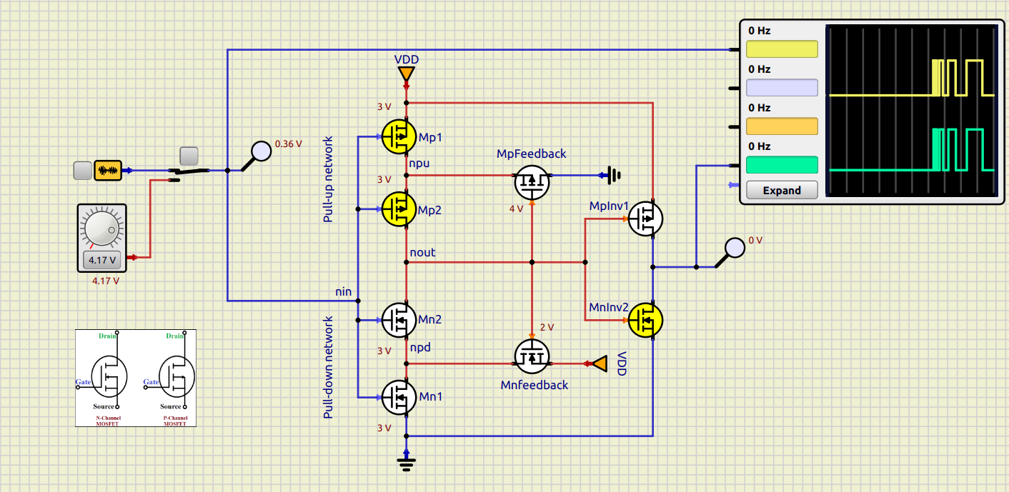 Schmitt trigger analysis: Look up a CMOS Schmitt trigger schematic and identify which transistors set the upper vs lower threshold¶