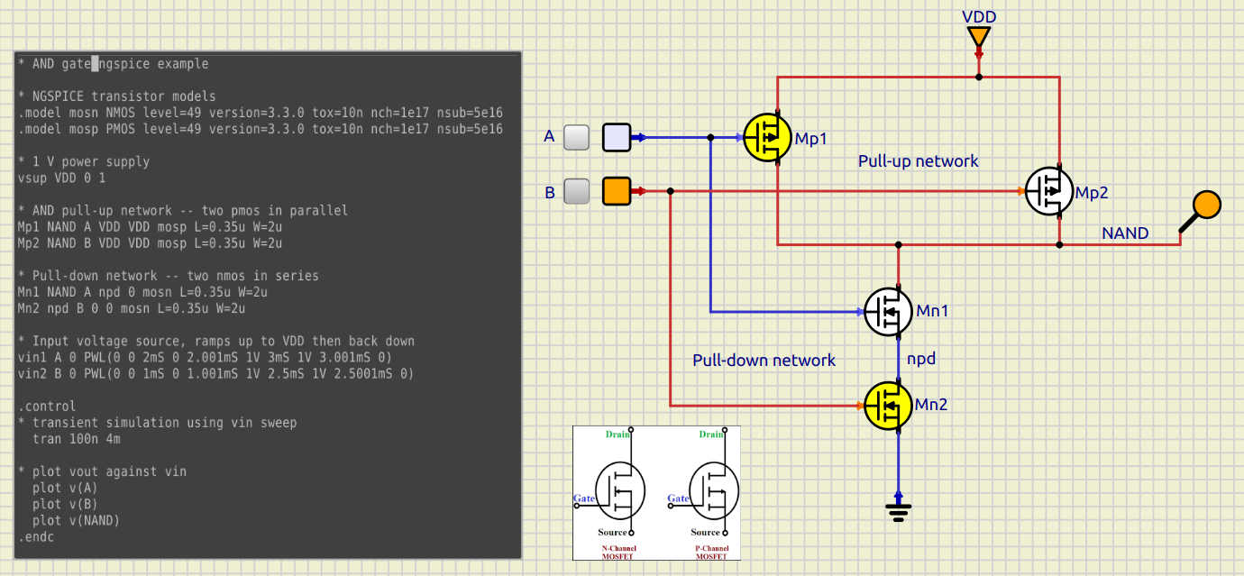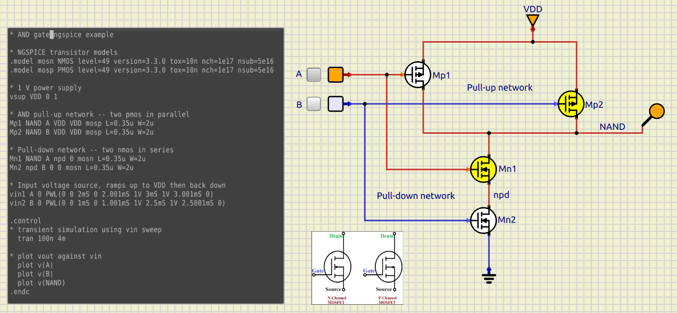Reuse and.sp netlist, which has a 2-input AND gate to make a 2-input NAND gate (e.g., remove the output inverter)¶