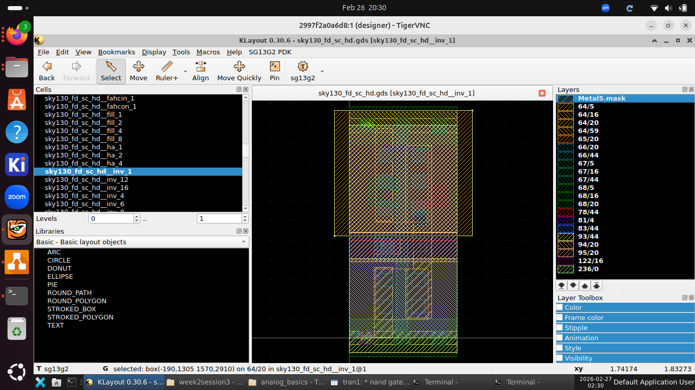 Explore a standard cell: Open the sky130 standard cell library in KLayout and find an inverter (sky130_fd_sc_hd__inv_1). Identify metal, poly, and diffusion layers.¶