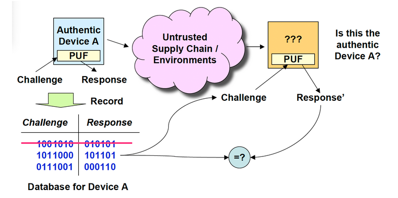 For each manufactured PUF installed on a device, a huge amount of pairs are recorded in a database. This is the digital device fingerprint. Once deployed, the device generates a challenge, submit it to the PUF and sends the challenge-response pair to the server. Server answers with a Go-NoGo and mark the pair as used in the database, to prevent replay attacks.