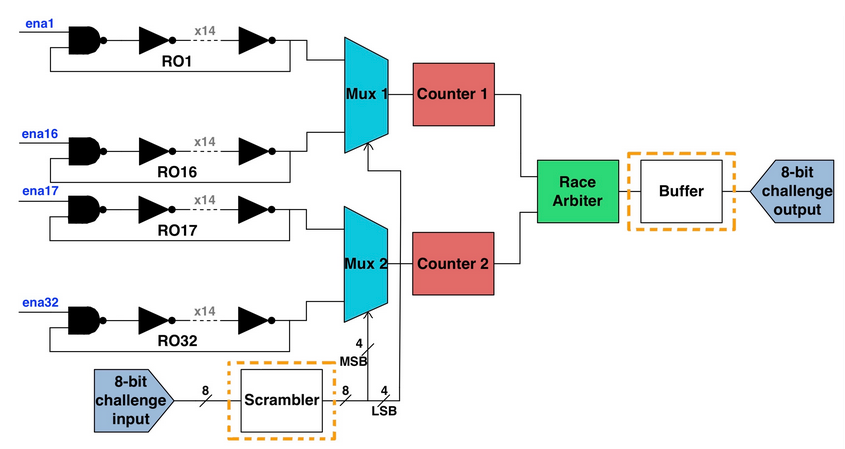 At lower level, a ring oscillator (RO) PUF is a delay-based PUF which uses frequency variations in inverter chains to generate unique IDs. ROs are made up of an odd numbers of inverters connected in a chain which oscillates at a specific frequency. Process variation introduced during IC manufacturing causes the frequencies in each RO to be slightly different. An RO PUF consists of identically-laid out ring oscillators fed into a two MUXs. The PUF challenge feeds into the MUX select lines and chooses which two ROs to compare. The MUX outputs are fed into a counter, each of which counts up to a preset value. If the top or the bottom counter reaches the preset value, the race arbiter will output a ‘1’ or a ‘0’ as the response depending which counter finishes first.