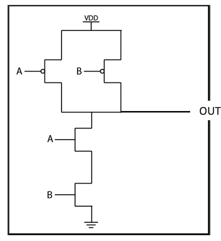 NAND pull-up network – two pmos in parallel Mp1 NAND A VDD VDD sky130_fd_pr__pfet_01v8 L=0.35u W=2u Mp2 NAND B VDD VDD sky130_fd_pr__pfet_01v8 L=0.35u W=2u