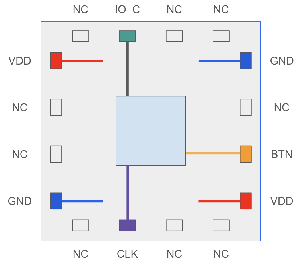 Connect VDD, GND to this board. Put external 10MHz crystal ocillator to this chip. Then connect osilloscope to IO_C. If it generate the wave that have 36nsec wave length, it is working collectly.