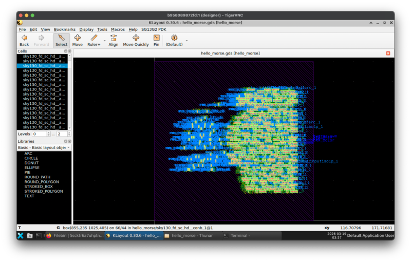 hello_morse.v debounce.v ↓ yosys synth.ys ↓ hello_morse_synth.v ↓ OpenROAD pnr.tcl ↓ hello_morse.def / hello_morse.gds