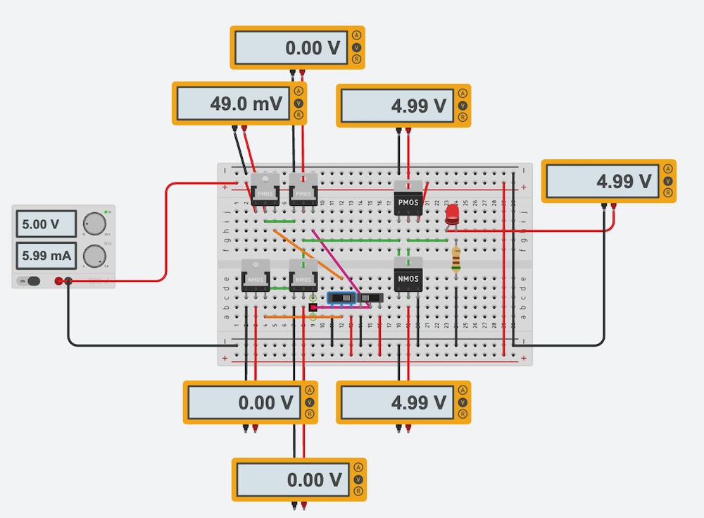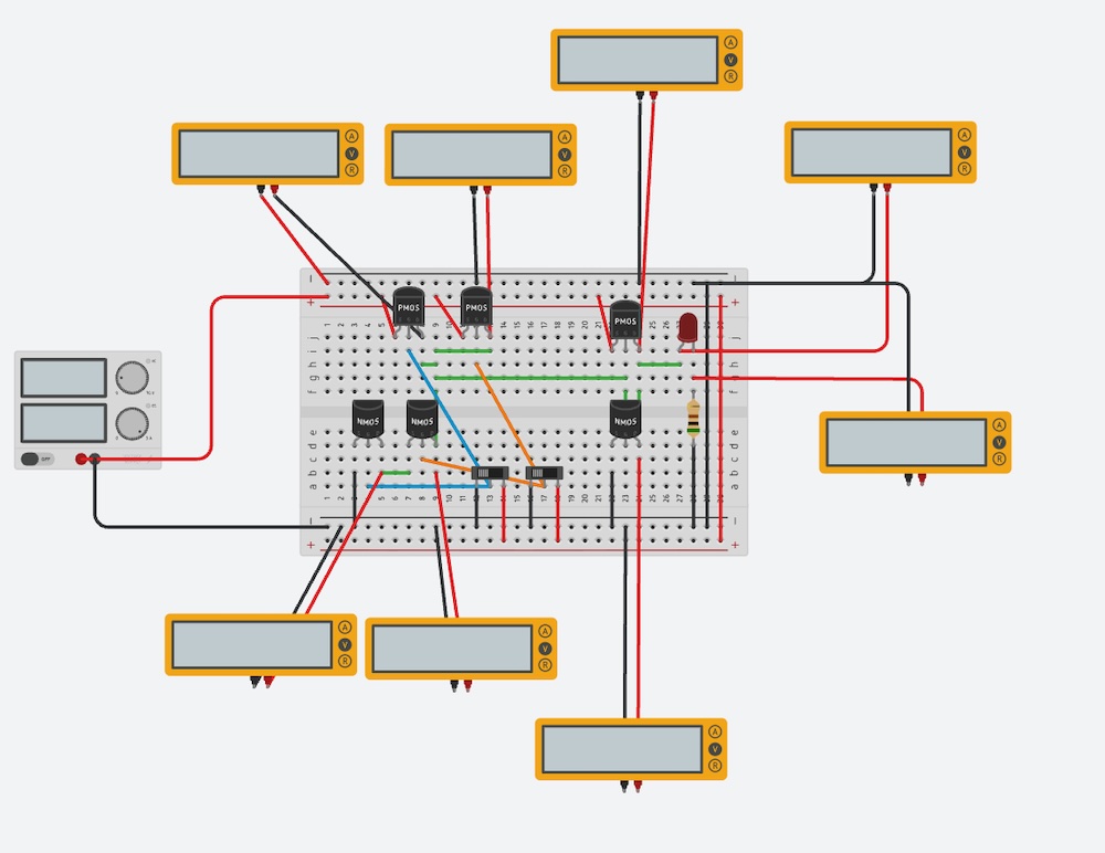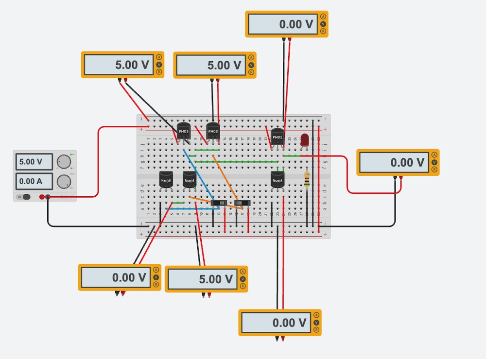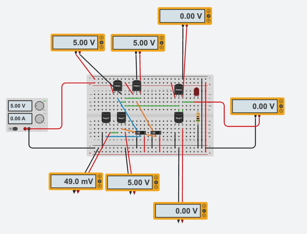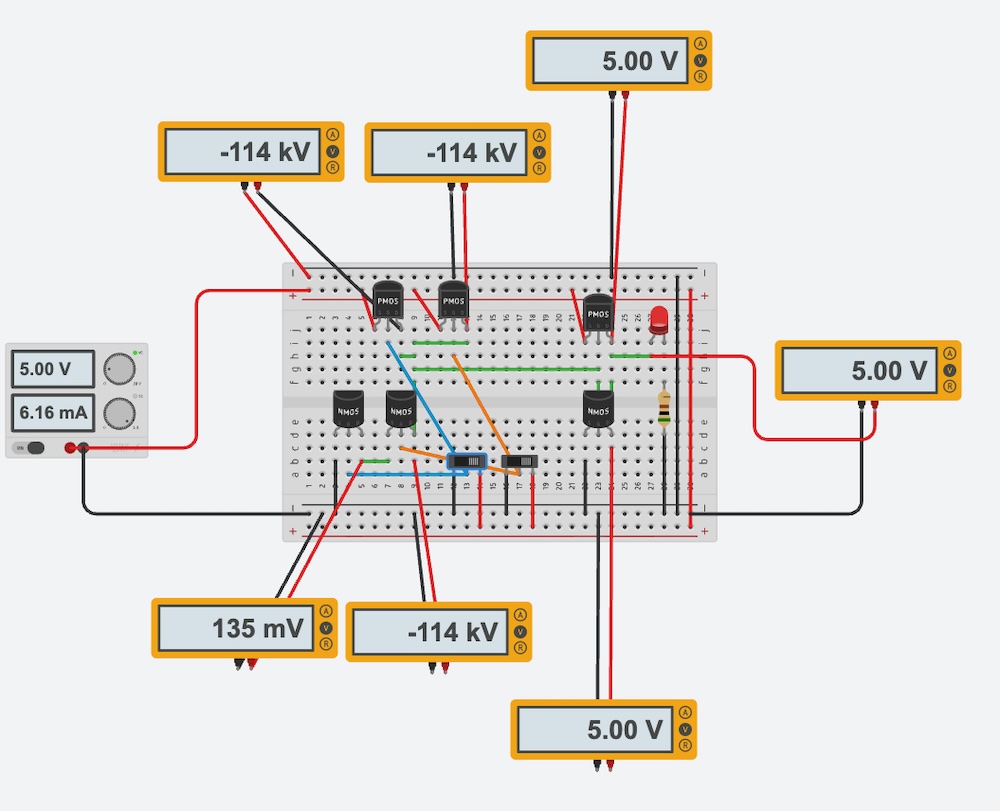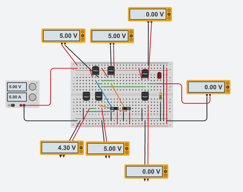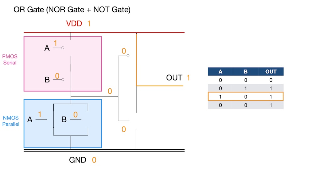 Here is the simulation of OR Gate on the TinkerCAD. As shown above, it would be consist of NOR Gate (PMOS series and NMOS parallel) and NOT Gate.