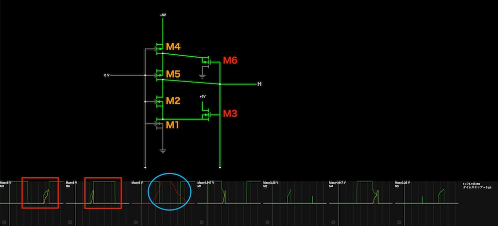 Then following simulation circuit is the one that is added one more PMOS and NMOS. But, the left-bottom graph show still unstable when the output turn into HIGH/LOW.