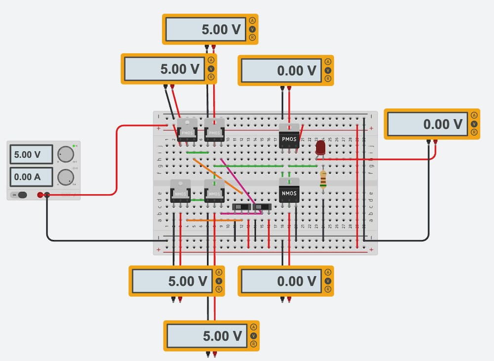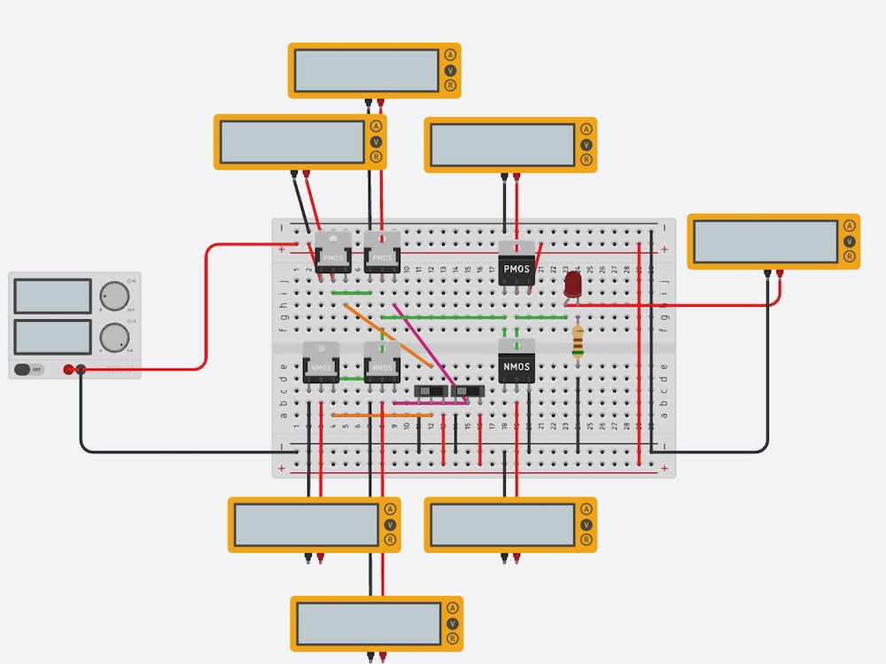 Here is the simulation of AND Gate on the TinkerCAD. First, the circuit doesn’t worked. And, I found out that I failed to understand how to connect NMOS. NMOS source should be connected to GND (Not to the Drain of PMOS). I made two slide switch to input HIGH/LOW to both PMOS and NMOS Gate.