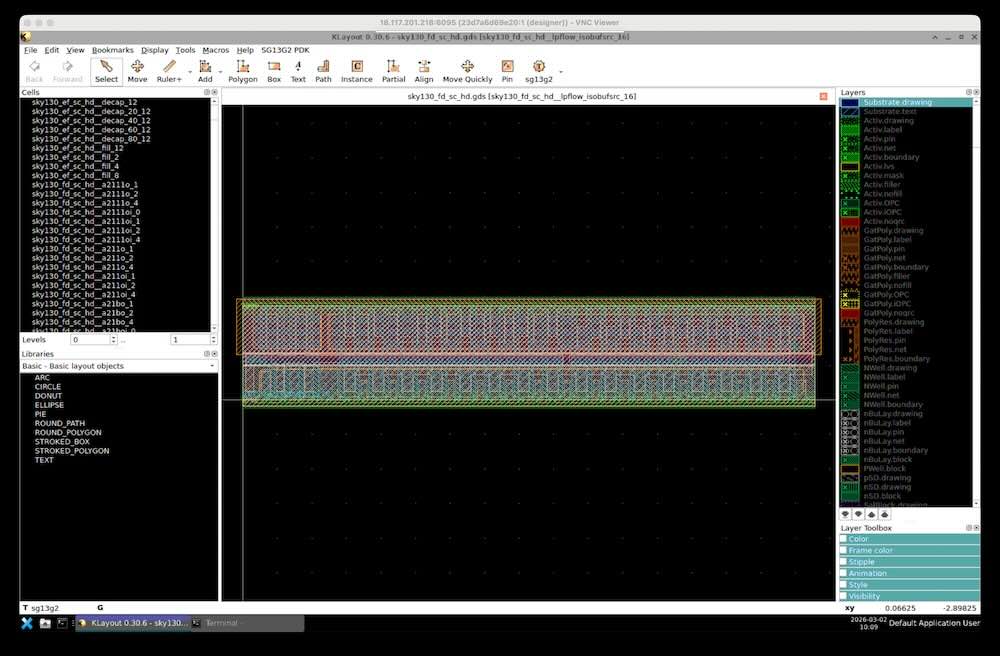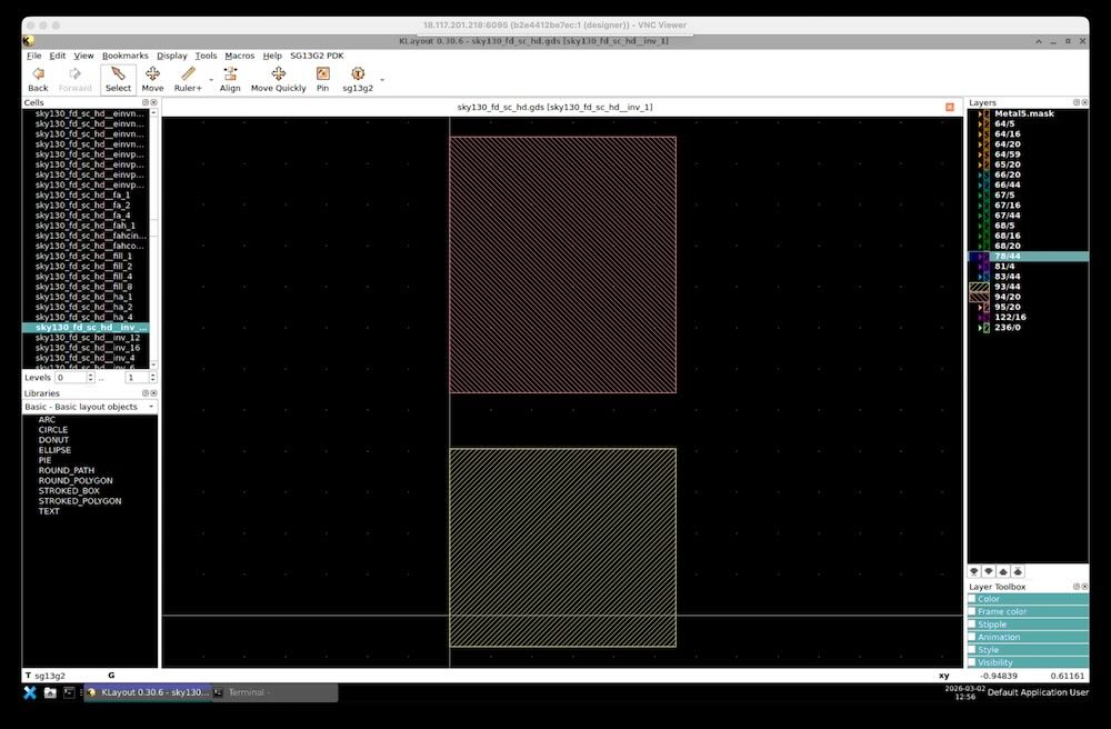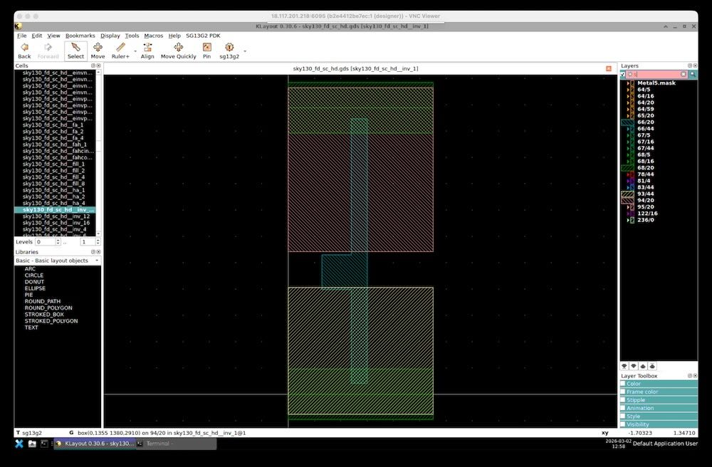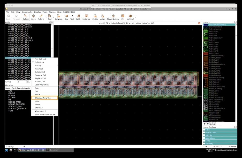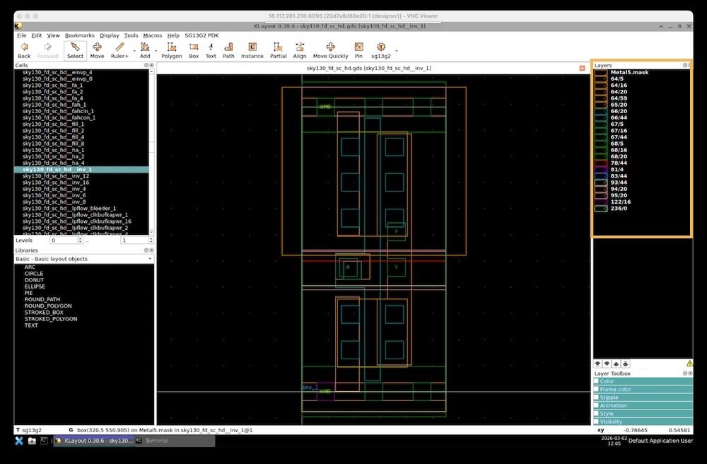 Explore a standard cell: Open the sky130 standard cell library in KLayout and find an inverter (sky130_fd_sc_hd__inv_1). Identify metal, poly, and diffusion layers.