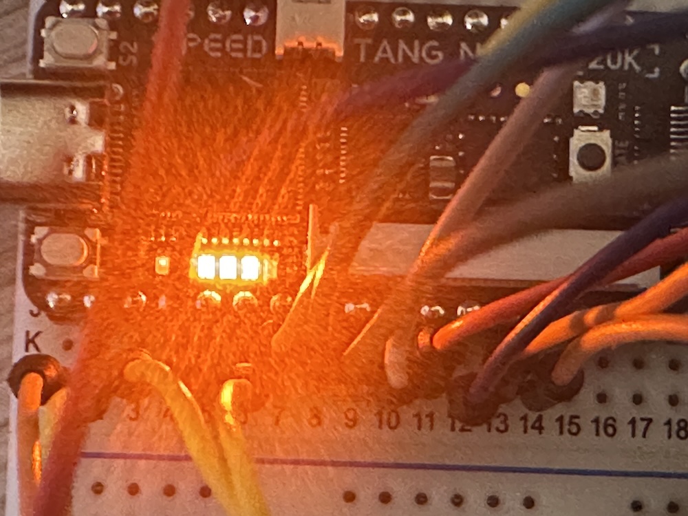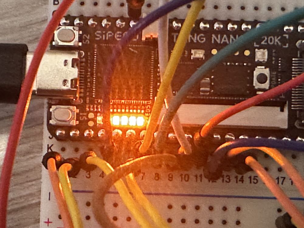 First, calcuiaton does not started, so all LEDs are blinked (make sure Tang Nano 20K internal LEDS are worked as active-low ). Here, from left ACC0 (first-bit),ACC1(second-bit), ACC2(third-bit), ACC3(4th-bit).