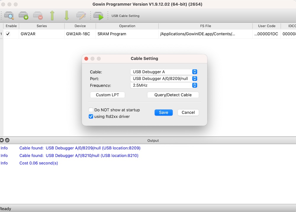 Fist, check the USB conenction. If my Tang Nano 20K is connected to my Mac, it could be found out here. Click “save” here.