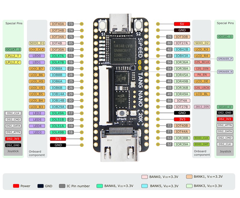 Here is the Tang Nano 20K’s pinout.